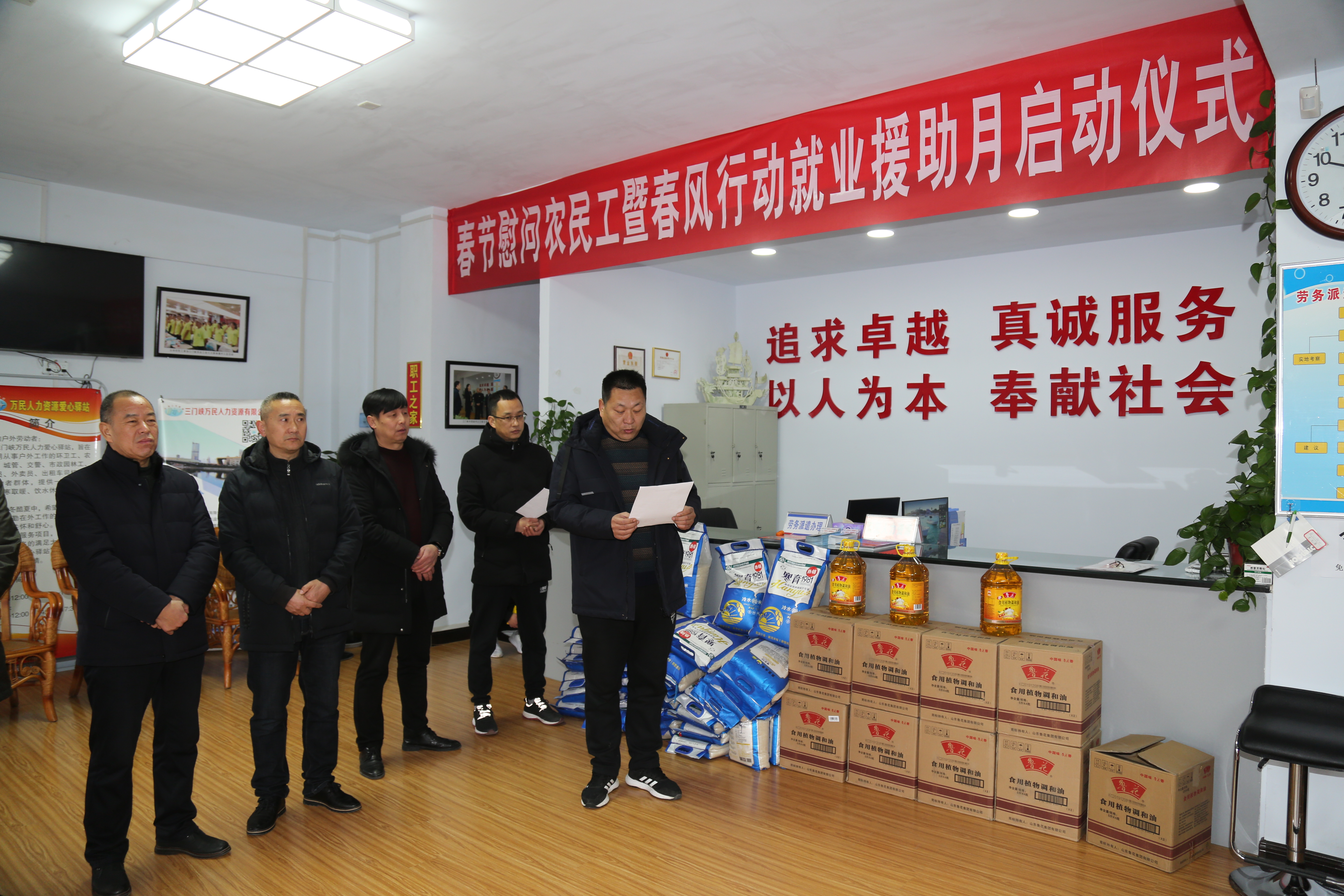 2020年1月18日上午,在三門峽市總工會(huì)的指導(dǎo)下,三門峽萬民人力資源有限公司和公司工會(huì)委員會(huì)舉行了2020年春節(jié)慰問農(nóng)民工暨春風(fēng)行動(dòng)就業(yè)援助月啟動(dòng)儀式。市總工會(huì)助理調(diào)研員吳英民、市總工會(huì)幫扶中心主任趙春、市人社局及部分縣市區(qū)和鄉(xiāng)鎮(zhèn)的相關(guān)人員出席了啟動(dòng)儀式,數(shù)十名農(nóng)民工代表和公司農(nóng)民工服務(wù)站的負(fù)責(zé)人參加了儀式。